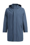 Een lange regenjas van waterafstotend, functioneel materiaal. De jas heeft een afneembare gevoerde capuchon, een ritssluiting met kinbeschermer en een drukknoopsluiting. Het model heeft steekzakken met drukknoopsluiting, raglanmouwen met een verstelbare drukknoop en een split achter. Gevoerd