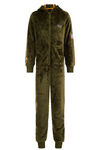 Een regular fit onesie van teddy-kwaliteit met een capuchon voorzien van applicaties, lange mouwen, een ritssluiting, twee steekzakken en lange pijpen.