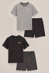 Slapen in stijl? Deze jongenspyjama's weten hoe. De een is effen, de andere heeft een streepprint. Beide shirts hebben een ronde hals, korte mouwen en een ‘recharge mode’-print met batterij op de borst. De bijpassende korte broeken hebben een elastische tailleband voor extra gemak.