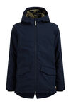 Een gevoerde jas van waterafstotende kwaliteit met een teddy voering, twee zakken met klepsluiting, een ritssluiting met kinbeschermer en een capuchon.