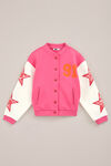 Dé must-have voor meisjes. Deze oversized bomber uit de Tina Festival-collectie heeft een ronde hals, lange mouwen, steekzakken en drukknoopsluiting. De kanten sterren op de mouwen? Wauw!