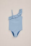 Regular fit, schuine halslijn, vanaf links ruches langs de boord en rechts een dun verstelbaar schouderbandje. Heeft een seersucker structuur en fijne streep print.