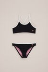 Regular fit. Bovenstuk heeft dunne schouderbandjes die kruislings lopen (niet verstelbaar). Heeft net zoals het broekje een kleine print van een hartje aan de linkerkant. Hebben beide een ribbel structuur.