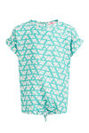 Een regular fit blouse van gerecycled polyester met een all-over dessin, een knoopdetail aan de onderkant, een ronde hals en korte mouwen.