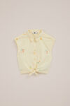 Netjes, maar wel met een knipoog. Deze blouse heeft een kraag, knoopsluiting en is mouwloos. Je knoopt ’m onderaan, het elastische deel achter zorgt voor comfort en de fruitborduursels geven ’m een vrolijk detail.