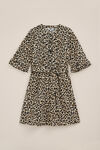 Schattig en tijdloos. Deze jurk van 100% katoen heeft een ronde hals, knoopsluiting en plooidetails die het een klassieke look geven. Met een elastische taille en driekwart mouwen is het een trendy keuze voor elke gelegenheid.