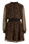 Een regular fit jurk van geweven kwaliteit met een dessin, een elastische tailleband en glittergaren. Het model heeft een ronde hals en lange mouwen met gesmokte boorden.