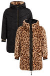 Deze parka kun je aan twee kanten dragen. De ene kant heeft een gewatteerde look met luipaardprint en de andere kant is van imitatiebont met luipaardprint. Het model heeft een ritssluiting met kinberschermer, twee steekzakken met drukknoop en lange mouwen met geribde boorden.