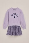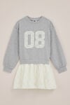 Zacht, speels en lekker girly. Deze sweatjurk heeft een regular fit met een bovenstuk van sweaterstof, een ronde hals en lange mouwen met ribboord. Elke uitvoering heeft een eigen print of borduursel op het voorpand. Het rokgedeelte bestaat uit een kanten bovenlaag met daaronder een katoenen onderrok, en valt in een korte, vrolijke lengte.