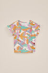 Rennen, springen, dansen - alles kan! Dit T-shirt met korte mouwen en een ronde hals is gemaakt om in te bewegen. De speelse ruffles op de mouwen en het vrolijke dessin maken elke outfit een feestje. Draait letterlijk met elke beweging mee.