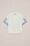 Stoer en lief in één look. Dit T-shirt heeft een oversized fit, een ronde hals en korte mouwen, en bestaat uit een effen top met een transparante kanten bovenlaag. De dubbele strepen en cijferprint op de mouwen geven dit item echt die sporty college vibe.