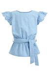 Een regular fit blouse van katoen met denimlook en een elastische taille met strikceintuur. Het model heeft een ronde hals, blinde ritssluiting en korte mouwen met broderie anglaise.