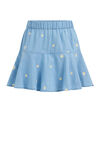 Een regular fit broekrokje van katoen met een denimlook en bloem borduur. Aan de buitenzijde is het een rokje met binnenin een broekje. Het model heeft een elastische taille