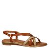 Dolcis dames sandaal. Deze comfortabele sandaal van het merk Dolcis is een echte must have voor de zomer. Uitgevoerd in imitatieleer met goud coating over de bandjes voor net dat beetje bling. De enkelband kan versteld worden met de gesp. De binnenkant van de banden is afgewerkt met imitatieleer. Voorzien van een zacht en dempend voetbed met textielen bekleding, hierdoor ervaar je optimaal comfort de hele dag door. Afgewerkt met een flexibele rubberen loopzool.