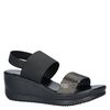 Nelson dames sandaal. Deze leuke sandalen uit onze Nelson-collectie kun je casual en chique stijlen. Uitgevoerd in imitatieleer met leuke metalic-coating met dot-patroon. De band om de wreef en enkel zijn elastisch en vormen zo goed om de voet. De band over de tenen is met imitatieleer afgewerkt. Voorzien van een imitatieleren voetbed die door het kussen over de lengte van de voet zorgt voor een fijne demping tijdens het lopen. Afgewerkt met een rubberen sleehak van 6 cm.