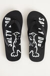 Een paar slippers van rubber met opdruk en een geribde zool voor grip.