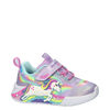 Skechers Unicorn Chaser meisjes sneakers. Sprankel bij elke stap met deze lichtgevende sneakers van Skechers! De bovenkant van de stof bestaat uit een regenboog-print met een eenhoorn aan de zijkant van de sneaker. Bevat een voering van textiel wat voor een ademend effect zorgt. Het voetbed bestaat uit textiel en een onderlaag van foam voor een comfortabele pasvorm. Afgewerkt met een rubberen loopzool die flexibiliteit en grip biedt.