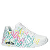 Skechers Uno Changed Love dames sneaker. Deze leuke colour changing sneakers uit de Love Heart-lijn kun je niet laten staan en is de perfecte schoen voor de zonnige dagen. Uitgevoerd in duraleer met perforatie op de neus voor betere ventilatie. De hartjes veranderen van kleur wanneer zij in de zon staan. Gevoerd met textiel en voorzien van een gewatteerde enkelkraag en hielkap voor meer comfort.