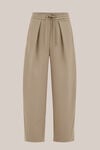 Volume op de juiste plek. Deze pantalon heeft een barrel fit, elastische taille met koordjes, haak- en ritssluiting, twee steekzakken en één paspelzak achter. De plooien voor geven volume dat goed werkt met strakke tops en simpele sneakers.