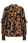 Een regular fit blouse van geweven kwaliteit met een dessin en ruches. Het model heeft een ronde hals, knoopsluiting en lange mouwen.