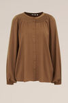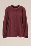 Kleine details, groots effect. Deze blouse valt soepel en heeft een ronde kraag met smokwerk, een elegante knoopsluiting en lange mouwen met een speelse elastische boord.