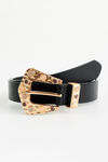 Een riem gemaakt van polyurethaan met een metalen gesp met details. Breedte: 3 cm.