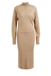 Een regular fit jurk van een fijngebreide kwaliteit met een ribstructuur. Het model heeft een col en lange mouwen. De jurk valt over de knie en is vanaf de middel strakker.