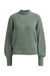 Een gebreide trui van een zachte, fluffy kwaliteit met een ribstructuur. Het model heeft en opstaande boord en ballonmouwen.