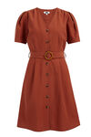 Een regular fit jurk van een lycellmix met een ceintuur en een knoopsluiting. Het model heeft een V-hals en korte mouwen. De jurk valt boven de knie.