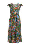 Een regular fit jurk van viscose met een dessin en strikceintuur. Het model heeft een V-hals en korte mouwen. De jurk valt over de knie en heeft volant aan de onderkant.