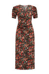 Een regular fit jurk van geweven kwaliteit met een dessin en knoopdetail. Het model heeft een overslaghals en korte geplooide mouwen. De jurk valt over de knie.