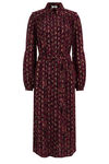 Een regular fit jurk van een viscosemix met dessin, glittergaren en strikceintuur. Het model heeft een normale kraag, blinde ritssluiting en lange mouwen. De jurk valt over de knie en heeft splitten aan de zijkanten.