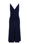 Een nauwsluitende jurk van jersey kwaliteit met glitter, structuur en plooidetail. Het model heeft een V-hals en valt over de knie.