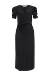 Een regular fit jurk van geweven kwaliteit met een knoopdetail. Het model heeft een overslaghals en korte mouwen. De jurk heeft een split aan de voorkant en valt over de knie.