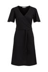 Een regular fit jurk van een gerecyclede polyestermix met structuur en strikceintuur. Het model heeft een V-hals en korte mouwen. De jurk valt op de knie.