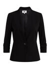 Een nauwsluitende blazer van jersey. Het model heeft een knoopsluiting, driekwart mouwen met plooidetails onder aan de mouwen, twee zakken op het voorpand en een split op het achterpand. Gevoerd.
