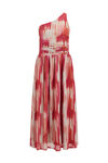 Een nauwsluitende jurk van plissé-kwaliteit met een dessin en glittergaren. De jurk heeft one-shoulder en valt over de knie.
