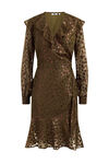 Een regular fit overslagjurk van lurex kwaliteit met een dessin, volant en een striksluiting. Het model heeft een V-hals en lange mouwen.