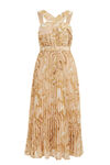 Een regular fit jurk van geweven kwaliteit met een dessin en plissérok. Het model heeft een halternek en een blinde ritssluiting.