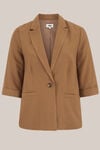 Aantrekken, schouders recht, gaan. Deze lichtgewicht blazer heeft een regular fit, blazerkraag en knoopsluiting. Afgewerkt met twee paspelzakken en 3/4e mouwen met omgeslagen boord. De fijne kreukstructuur zorgt voor een relaxte uitstraling.