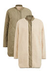 Een loose fit jas van geweven kwaliteit en teddy kwaliteit met structuur en een drukkknoopsluiting. Het model heeft twee steekzakken, een ronde hals en lange mouwen.