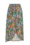 Een rok van viscose met een dessin en overslag. Het model heeft een elastische taille en valt over de knie.