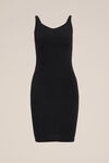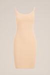 Een figuurcorrigerende jurk met verstelbare, elastische schouderbandjes en een siliconenstrip aan de onderkant, zodat de jurk om zijn plek blijft zitten.