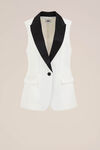 Creëer een moeiteloos stijlvolle look. Dit regular fit gilet van jerseymix heeft een stijlvolle smokingkraag, knoopsluiting en paspelzakken, met een opvallend contrast van off-white en zwarte, satijnen details.
