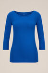 Een nauwsluitend T-shirt van een rekbare katoenmix met driekwart mouwen en een ronde hals.