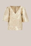 Subtiele details, groots effect. Deze top heeft een regular fit, een V-hals en korte, wijde ballonmouwen met een elastische boord. De all-over 3D bloemen met gouden glittergaren zorgen voor een feestelijke, elegante uitstraling.