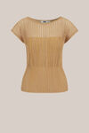 Laat je najaarsgarderobe glanzen. Deze trui heeft een regular fit, een boothals en korte mouwen, uitgevoerd in een grove verticale ribstructuur. Het bovenste deel van de borst is semi-transparant en loopt getailleerd voor een flatterende pasvorm. De stof bevat een subtiele glitter en kan als tweedelige set gecombineerd worden met een bijpassende rok.