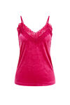 Een nauwsluitend velvet singlet met toegevoegde stretch, een kanten V-hals en verstelbare spaghettibandjes.