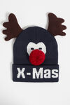 Een fijngebreide beanie met een dessin en rendier-oren.
