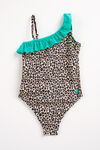 Een geheel gevoerd badpak met een all-over luipaarddessin en volant bij het one-shoulder detail.